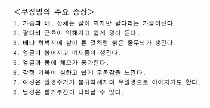 또한 고혈압, 당뇨병, 골다공증, 저칼륨혈증 등이 특징적인 증상으로 나타나며 생리불순, 여드름 증상도 있습니다. 어린이의 경우 키 성장에 비해 체중 증가가 현저하게 증가하는 경향이 있습니다.